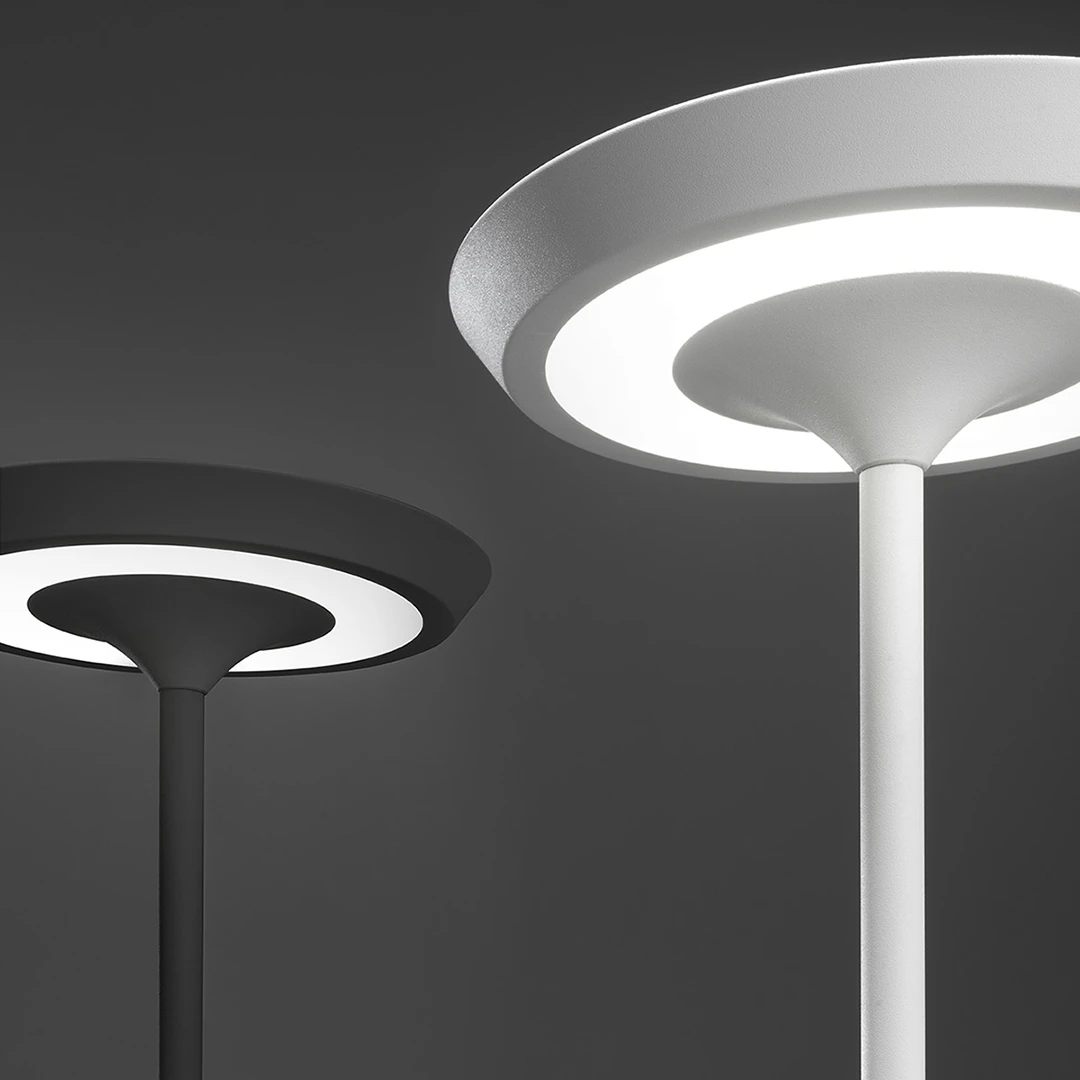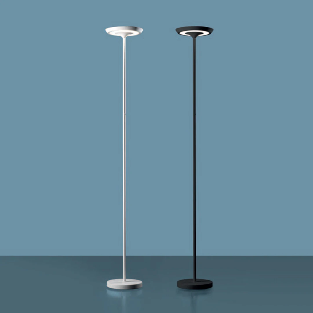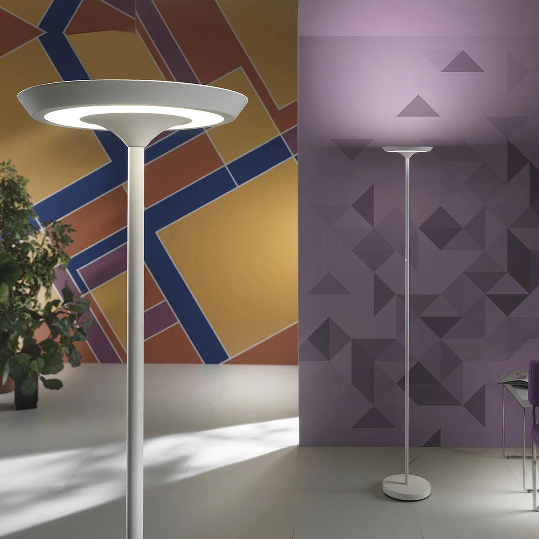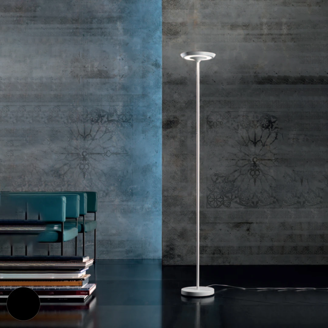 Il diffusore tondo in acrilico ha una doppia funzionalità: diffonde una luce diretta verso l'alto per un'illuminazione generale e una luce indiretta verso il basso ideale per la lettura.
